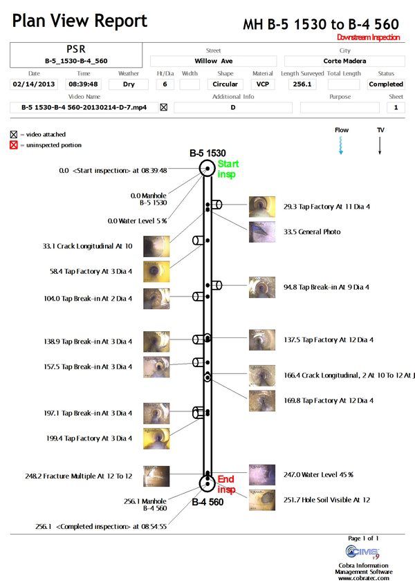 The results of the pipeline video inspection are produced in a digital format submitted on DVD’s or on a removable drive per customer request. Written reports accompany the video for each pipe segment inspected. Any faults detected in the pipe are noted along with the footage location. All camera technicians are PACP certified in pipeline assessment in accordance with NASSCO standards.