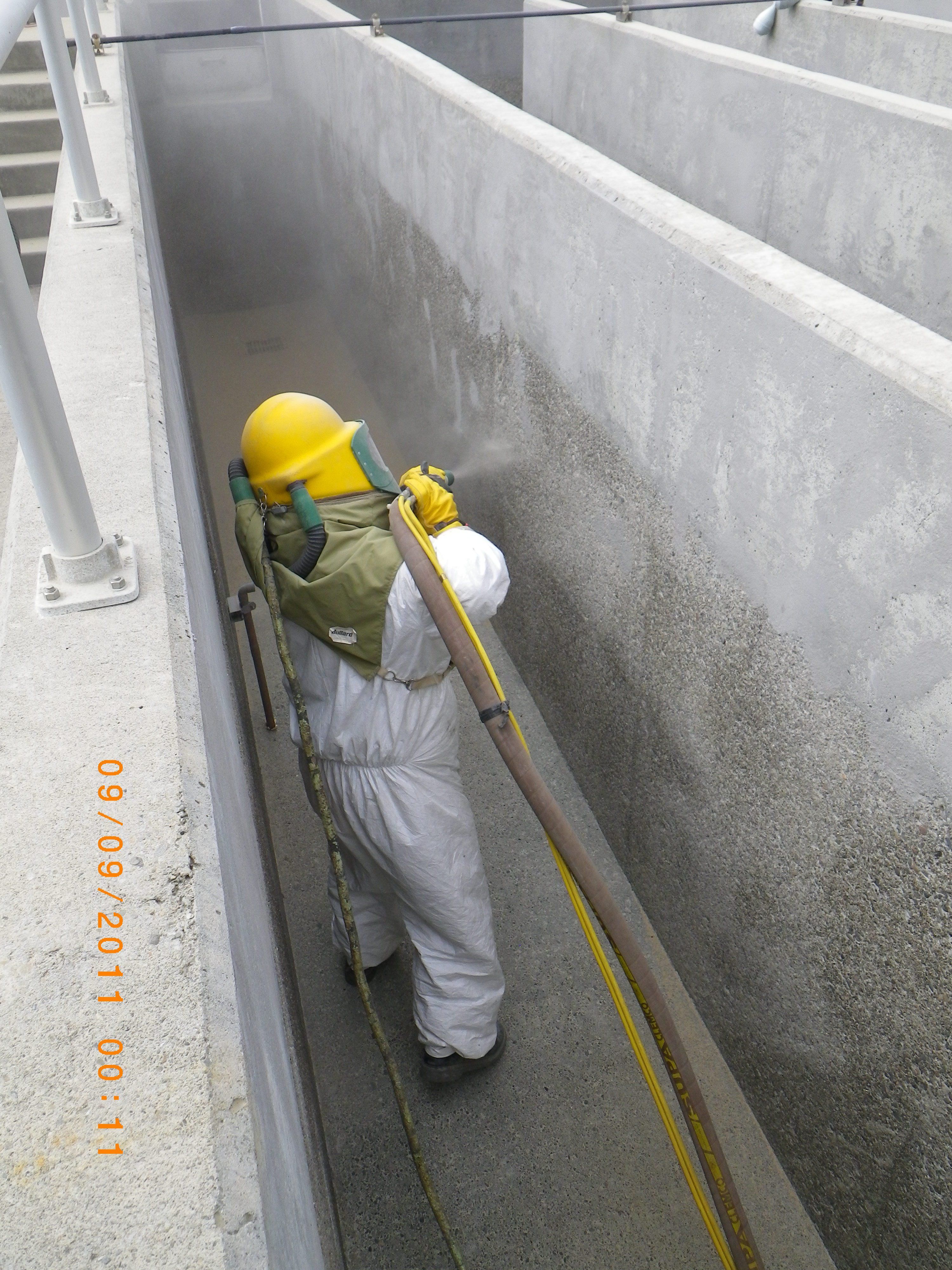 High-impact sand blasting is another method used to remove surface contaminants and is particularly useful when the water/sludge by-product of hydro blasting is restricted. When rehabilitation of the structure is necessary, the deteriorating surfaces will be sandblasted to remove loose debris creating a stable surface ready to accept the next step in the restoration process.
